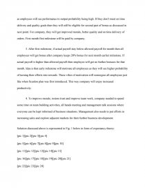 2. To boost morale, as employees reach 75% of allowed payroll they should be paid 20% of their salary as bonus as long as they meet “on time delivery” and “quality” goals documented in new plan details. These goals should be based on recent history and should be progressive every month at reasonable rate leading to organizational goals. This first milestone and allowed payroll limit should be displayed using simple graphics (via live data update) or barometer chart that will boost performance for full bonus. This will trigger cost savings in production by ideas as employees will see performance to output probability being high. If they don’t meet on time delivery and quality goals then they will still be eligible for second part of bonus as discussed in next point. For company, they will get improved morale, better quality and on time delivery of orders. First month first milestone will be paid by company.