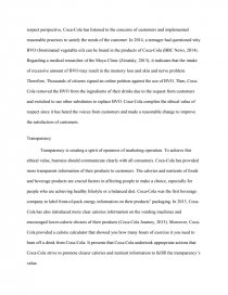 The Coca-Cola Company has made a lot of efforts in ethical marketing so as to maintain their good reputation and brand value. Coca-Cola should still focus more on the labeling and ingredients of their products to meet the expectations of customers. Besides, there are some rooms for Coca-Cola to improve and pay attention, for example, an unethical advertisement in their promotion which may violate the ethical value - honesty. Therefore, Coco-Cola may have to change their promotion strategies in a more ethical way to gain the support from customers.