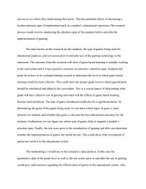 The methodology I would use in this research is data analysis. In this case the quantitative data of the grade level as well as the test scores prior to and after the use of gaming would give valid answers regarding the effectiveness of games in the educational system. Also sampling from a certain population and collecting the data could serve as valid research. In my research I will use gaming and education articles that highlight the significant aspect of gaming as well as statistical facts about the use of gaming in grade school and the need for it. In an article entitled “Reviewing the need for gaming in education to accommodate the “net generation”(G Bekebrede, HJG Warmelink, IS Mayer - Computers & Education, 2011) it is explained that students in present day are referred to as the “net generation’ which a generation that has grown up with computer games and other technology affecting their preferred learning styles and social interaction patterns. Because of this student of this generation prefers active, collaborative and technology-rich learning. In this case this would justify the implementation of games as a way to satisfy the needs of the new generation, who are more technologically advanced than previous generations. In addition to this, statistical facts were listed about the correlation between gaming and learning in the “net generation.”